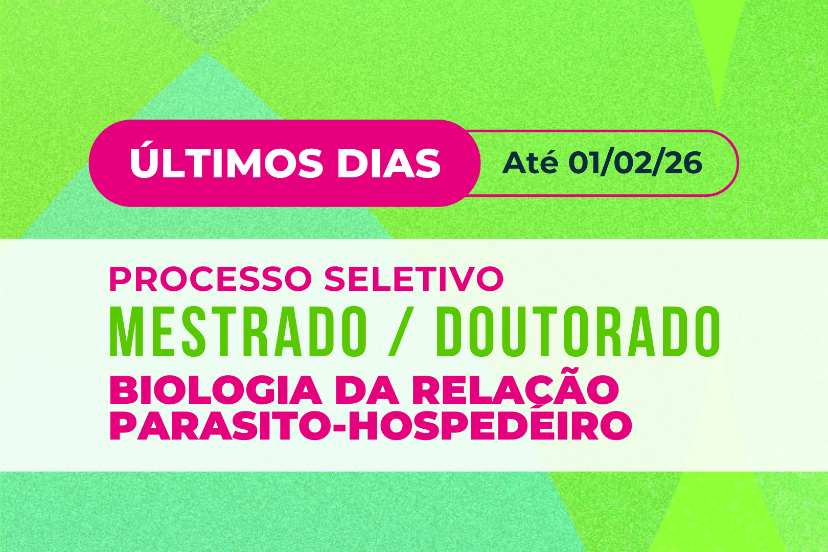 Não perca essa chance! O Programa de Pós-Graduação em Biologia da Relação Parasito-Hospedeiro (PPGBRPH), do Instituto de Patologia Tropical e Saúde Pública (IPTSP), da Universidade Federal de Goiás (UFG), está com inscrições abertas para o processo seletivo de mestrado e doutorado somente até às 23h59 do dia 1 de fevereiro de 2026.